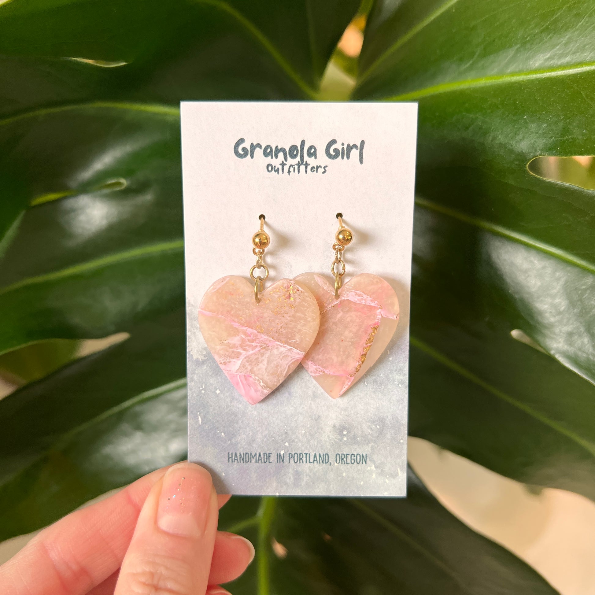 Add a touch of fun to your wardrobe with these one-of-a-kind Golden Heart Earrings. Featuring a faux pink and gold marble design, these stud dangle earrings are lightweight and easy to wear. Plus, with nickel-free findings, they're perfect for anyone with sensitive ears. Handmade with love and sure to make a statement! Handmade in Portland, Oregon!