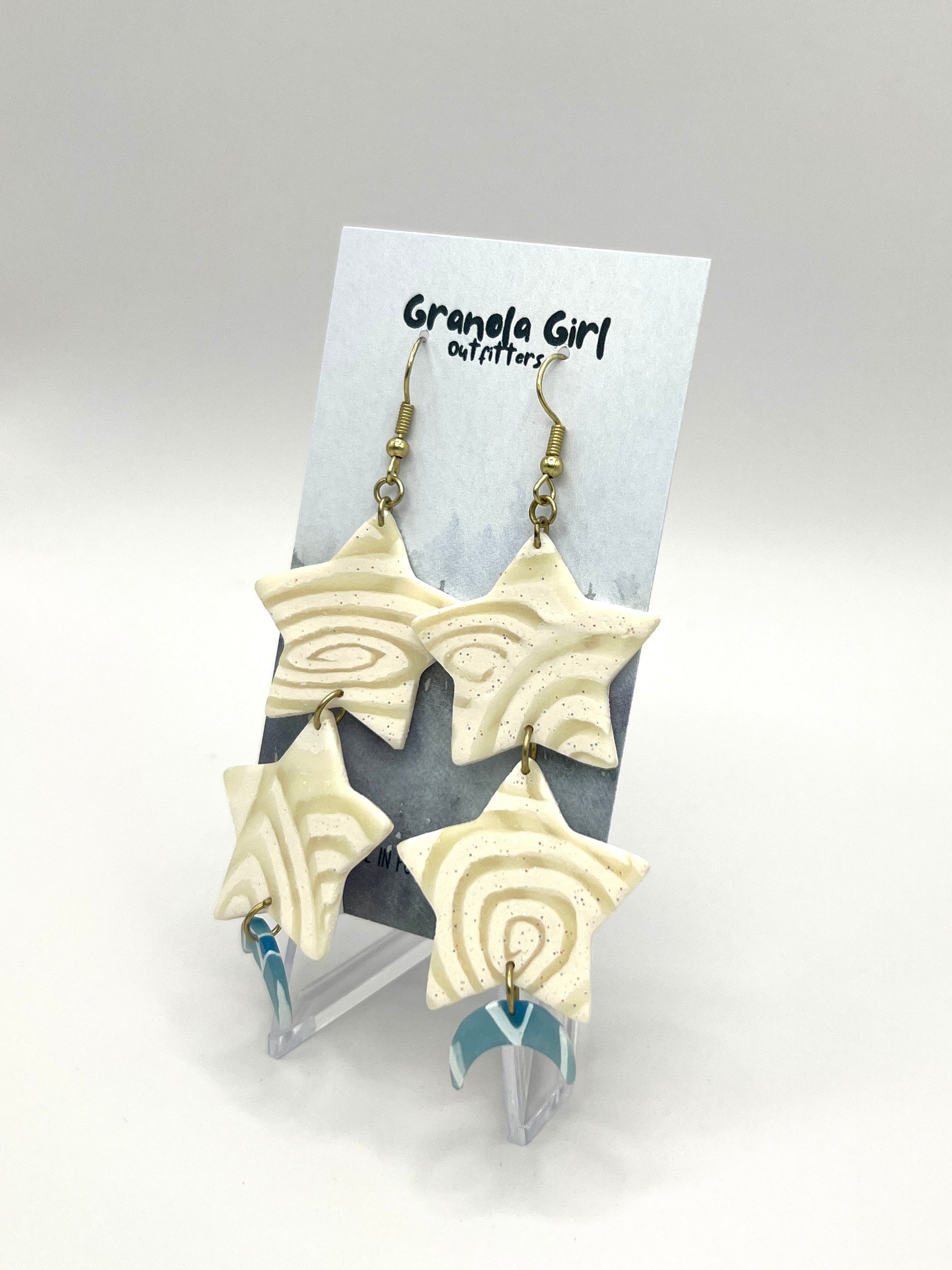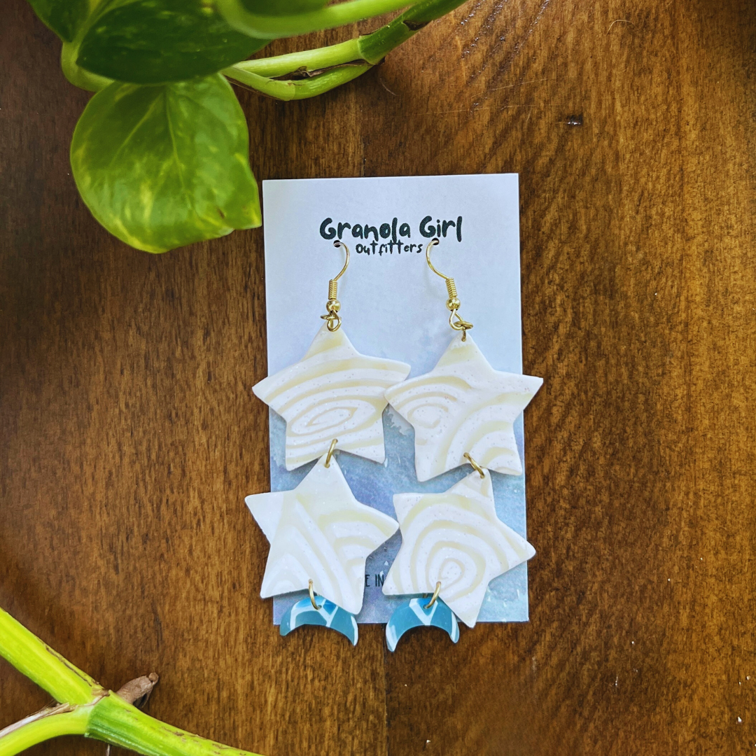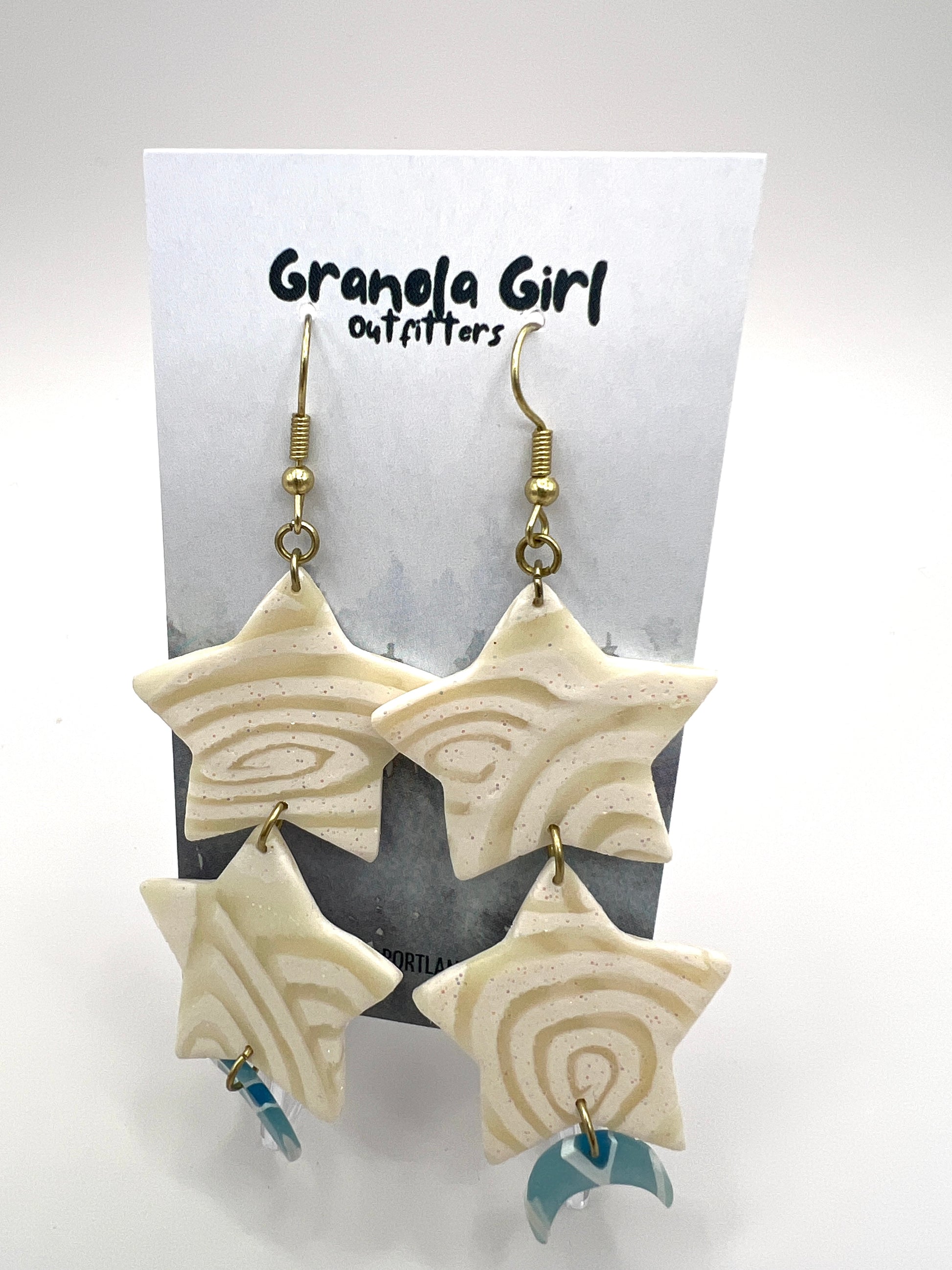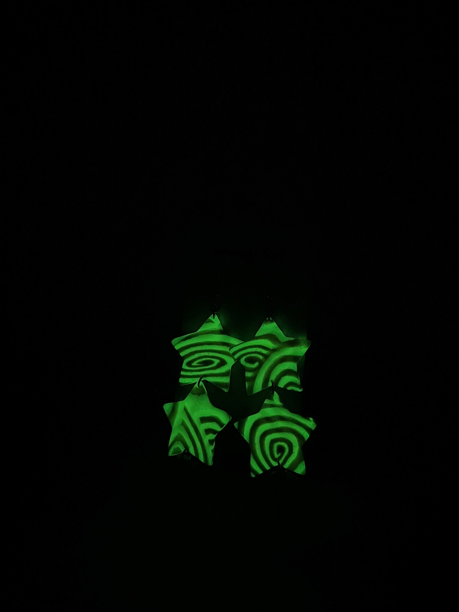 Add a touch of nostalgia with these playful glow in the dark star earrings! Inspired by childhood memories of glow-in-the-dark stars, these dangly earrings feature tiny crescent moons and a glittery swirl pattern. They're nickel-free and lightweight for a fun and comfortable wear. Bring out your inner child with these glow-in-the-dark beauties!