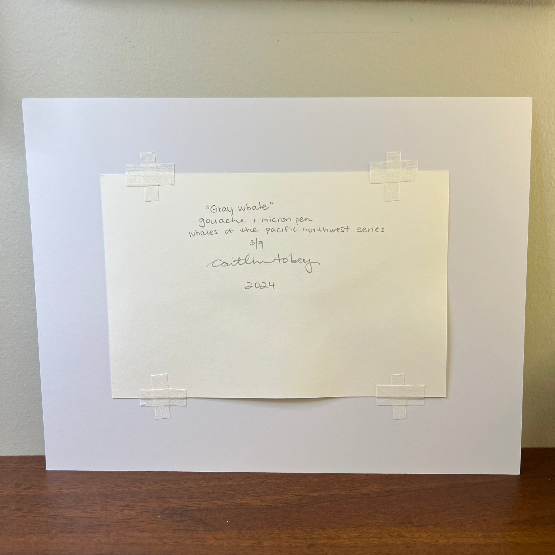The artwork titled “Gray Whale” measures 9" x 6" and is #3 of 9 in this limited original series. It is mounted to a 13" x 10" white mat, making it ready to place in a frame of your choosing.