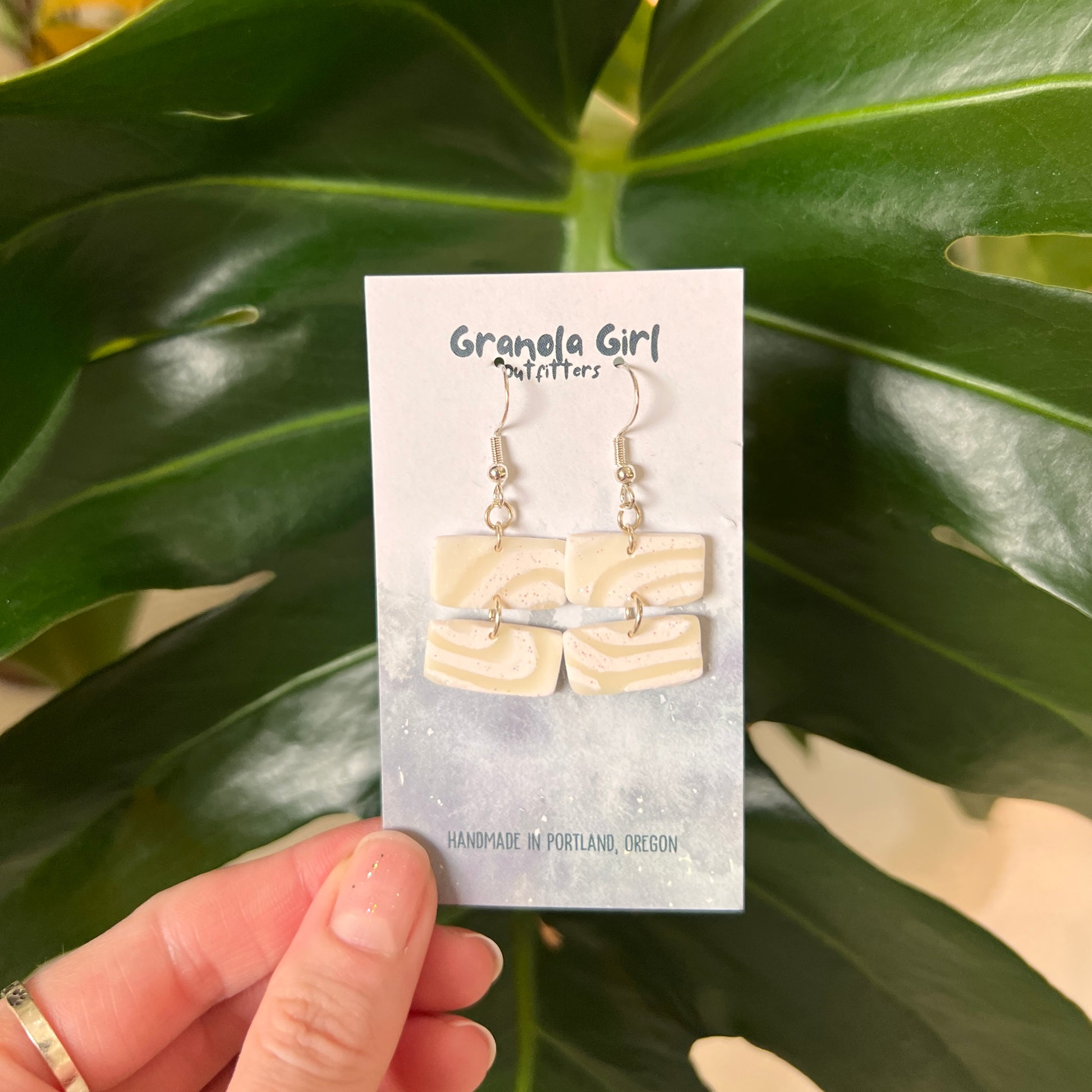 Add some whimsy to your wardrobe with our Cosmic Swirl #3 Earrings! Featuring a playful abstract glittery design, these handmade polymer clay earrings are one of a kind. They also glow in the dark for an extra touch of fun. Plus, with nickel-free silver findings, they're cute and lightweight for all-day wear. Get ready to make a statement with these unique earrings!