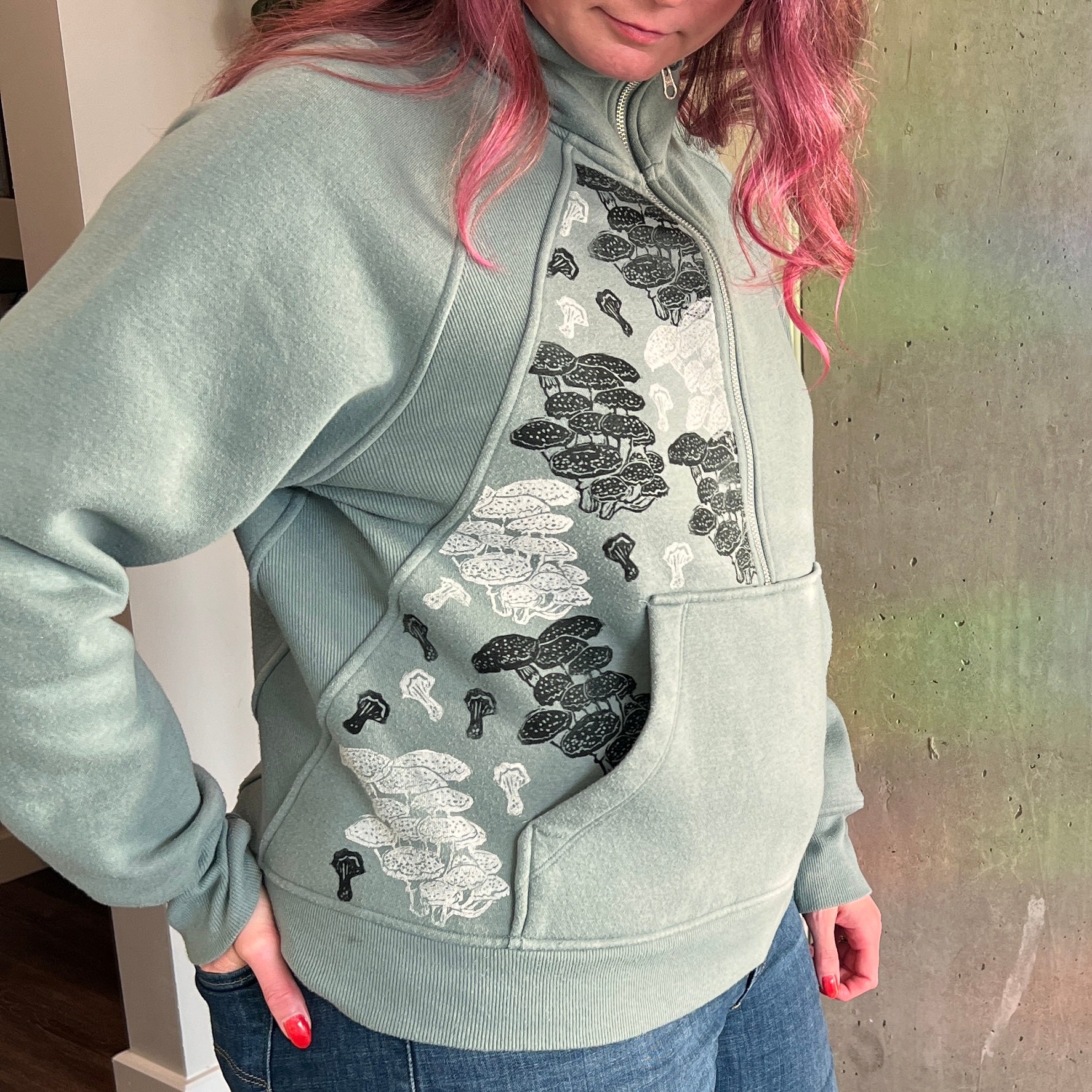 Upcycled Muted Teal Quarter Zip Sweatshirt– Hand Printed Mushrooms – Size Large – Unique Thrifted Clothing